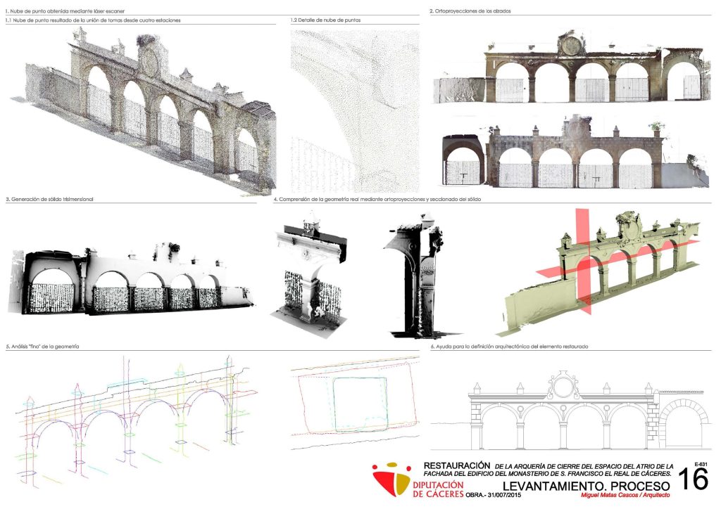 El objetivo de la intervención era la restauración y puesta en valor de la Arquería. Para establecer el programa de necesidades se requería en primer lugar conocer la edificación en todos sus aspectos y para ello era necesario el conocimiento del edificio y el diagnóstico sobre su situación actual. Mediante un levantamiento con nube de puntos obtuvimos la planimetría con la que pudimos realizar el análisis de las patologías de la edificación. También se realizaron los análisis químicos de los materiales; un análisis histórico para conocer las intervenciones que se habían realizado en el edificio en épocas anteriores; y por último, un análisis constructivo y de las patologías existentes.